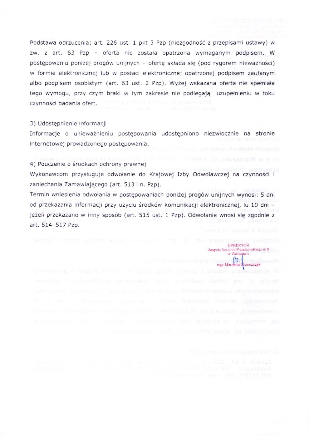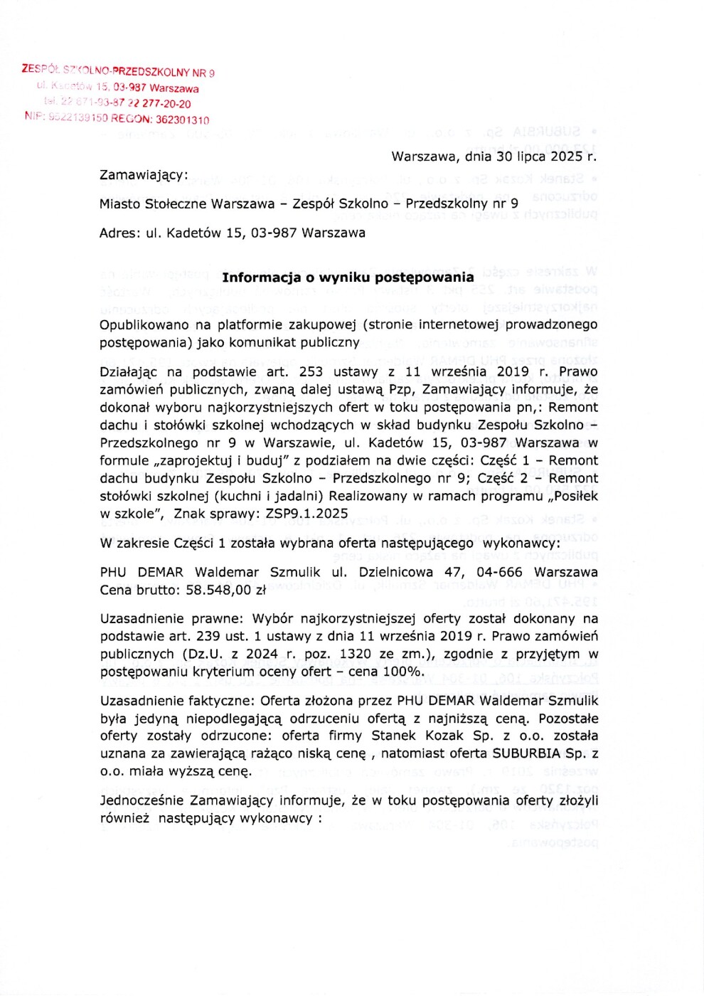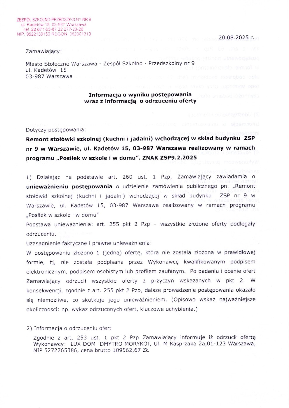 Informacja o wyniku postępowania i o odrzuceniu oferty przetargu w zakresie remontu stołówki szkolnej wchodzących w skład budynku Zespołu Szkolno – Przedszkolnego nr 9 w Warszawie, ul. Kadetów 15, 03-987 Warszawa w formule „zaprojektuj i buduj”