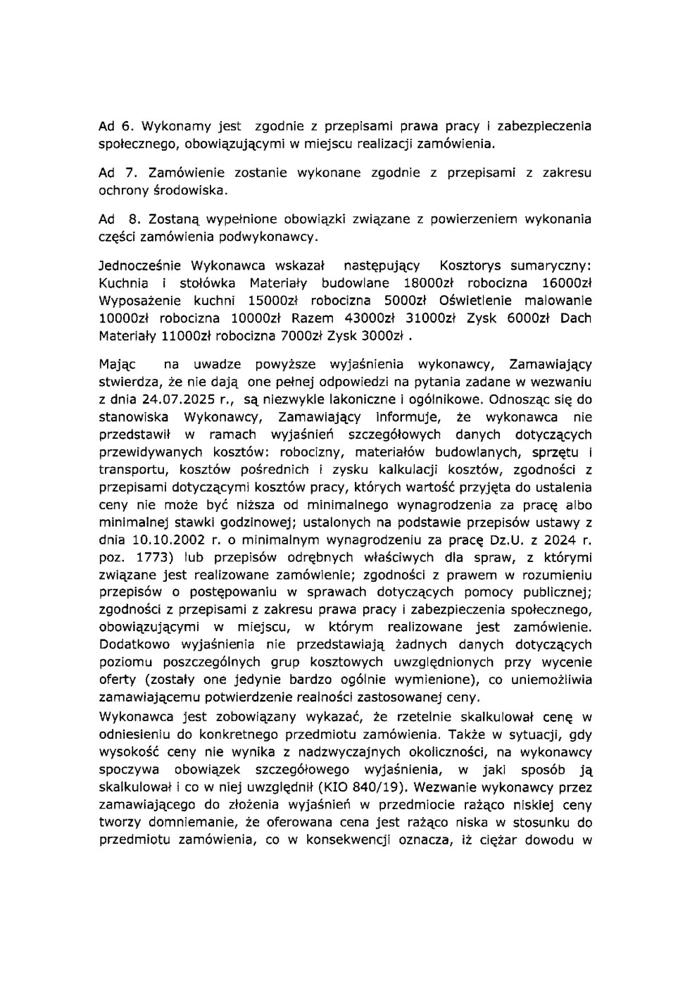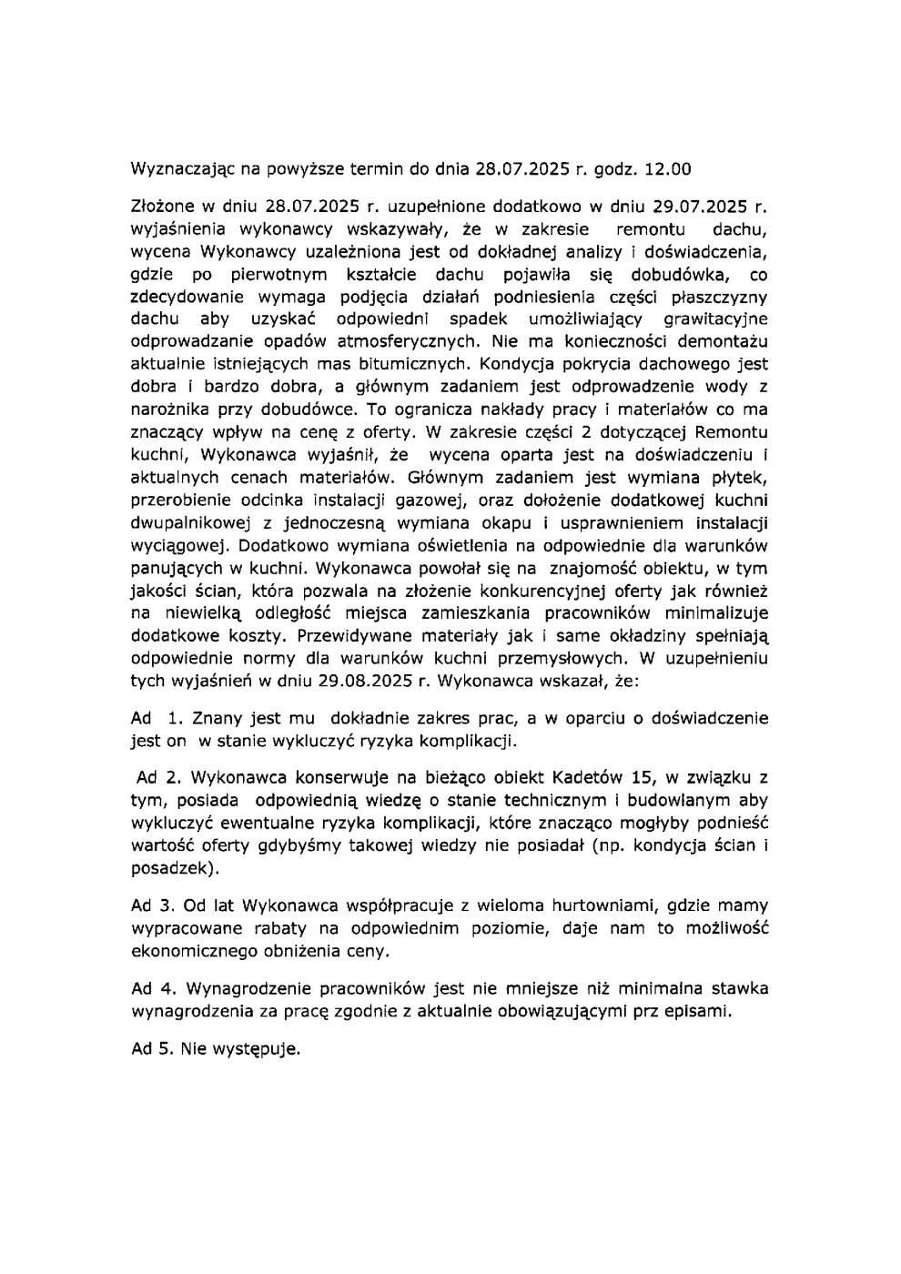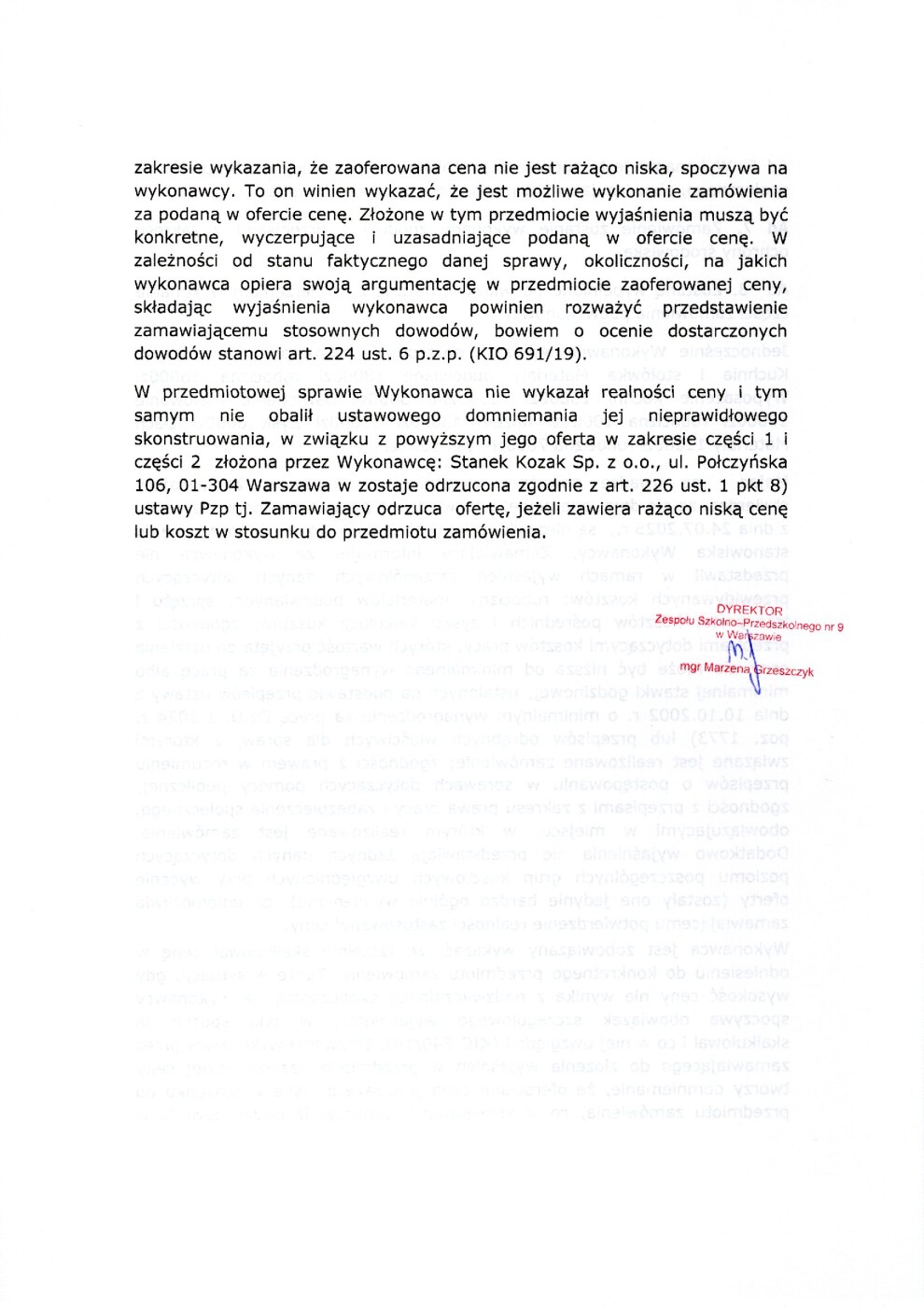 Informacja o wyniku postępowania i o odrzuceniu oferty przetargu w zakresie remontu stołówki szkolnej wchodzących w skład budynku Zespołu Szkolno – Przedszkolnego nr 9 w Warszawie, ul. Kadetów 15, 03-987 Warszawa w formule „zaprojektuj i buduj”